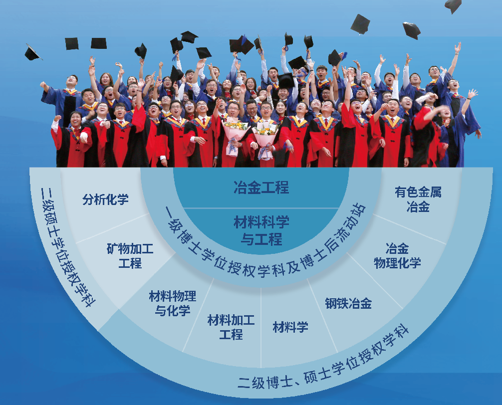 现有两个一级博士、硕士学位授权学科:材料科学与工程、冶金工程,1个专业硕士学位授权点:材料与化工,具有材料科学与工程、冶金工程两个博士后科研流动站,并与多家企业联合建立博士后工作站。