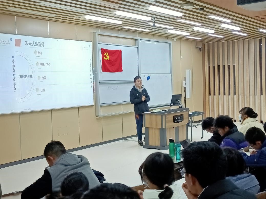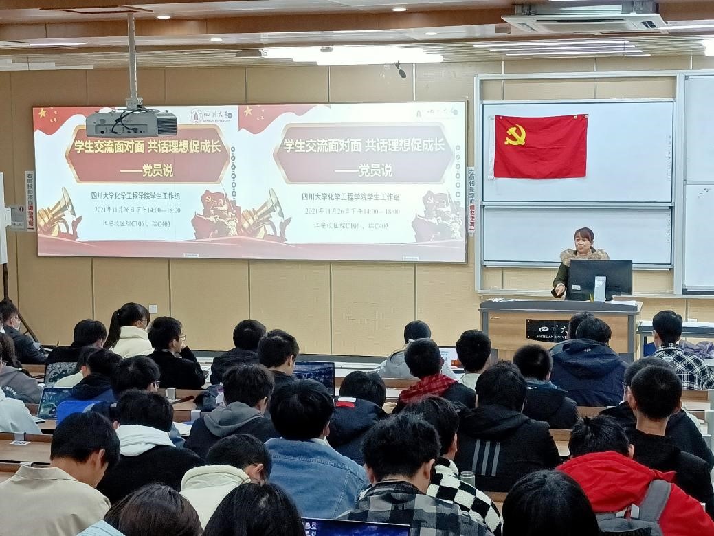 2021年11月26日下午,在四川大学江安校区综合楼C403教室和C106教室,四川大学化学工程学院2021级本科生成功举办了主题为“学生交流面对面,共话理想促成长——党员说”的保研党员经验交流分享活动。此次活动由化学工程学院2021级辅导员李珍珍老师主持,分别邀请了白晶荧、吴迪、伏浩晟、冷广童、薛雨蓁、黄天、务鑫、王珊珊、张浩宇和佟宇婷10位保研党员面向2021级新生分享了自己在保研过程中的经验。此次活动的目的是促进各位党员和大一新生的沟通交流,积极发挥中国共产党党员的先锋模范作用,引导大一新生培养良好的学习习惯,制定自己的大学生活目标。