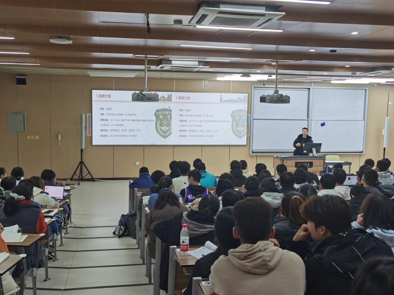 2021年11月26日下午,为向同学们宣讲我国征兵政策,号召有为川大青年立志从军,精忠报国,化学工程学院李珍珍老师、付率老师、李忆雯老师特地邀请到四川大学征兵宣讲团2019级学生王承宇和2021级段振南,分别于江安校区综合楼C座403室和106室,进行了一场别开生面的爱国主义教育专题讲座。