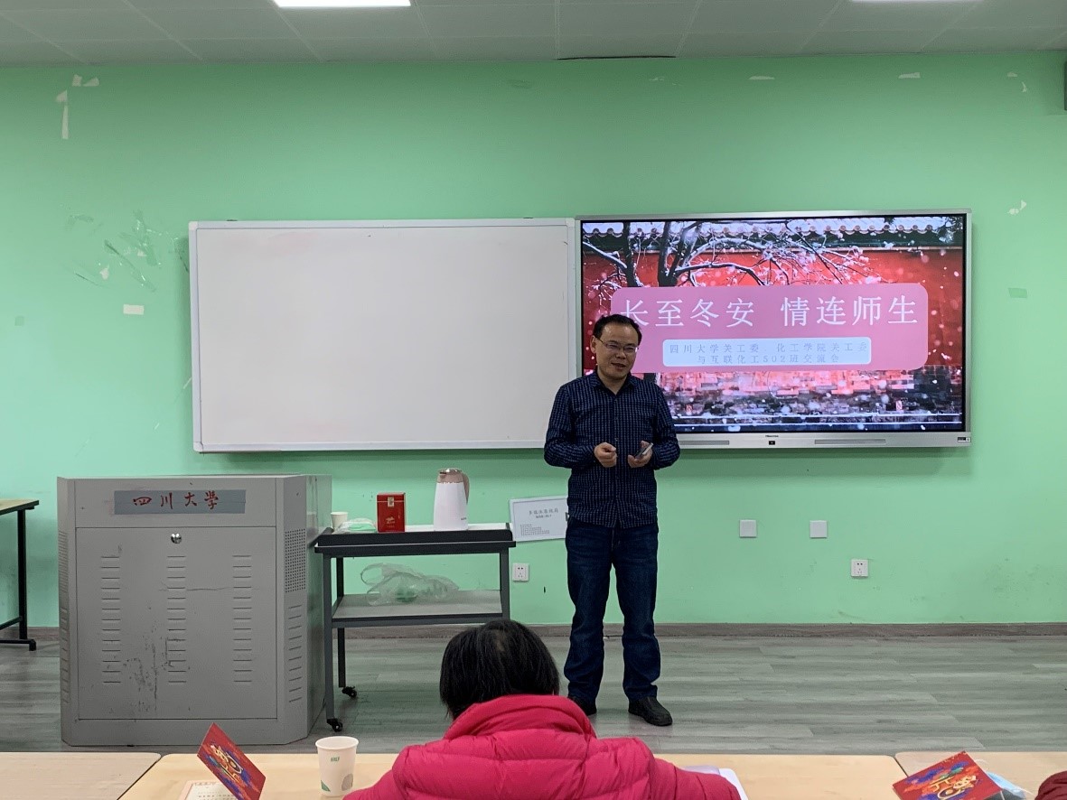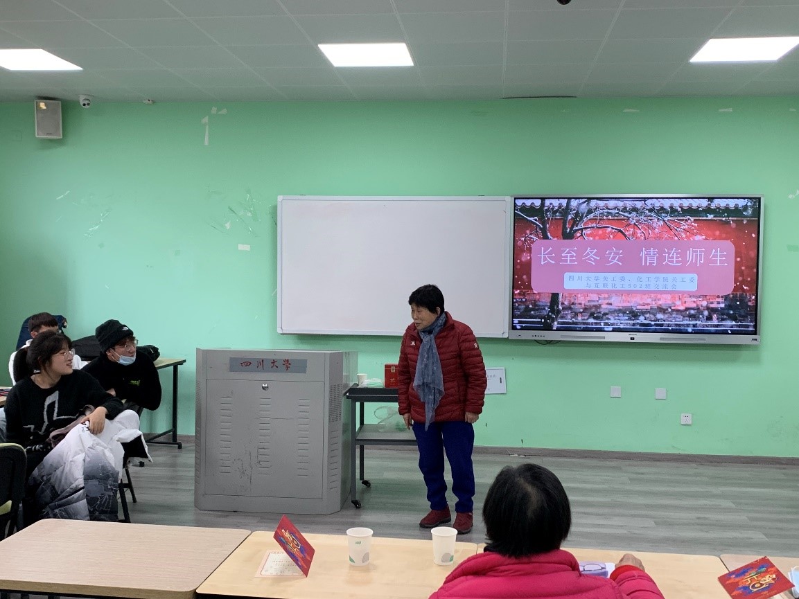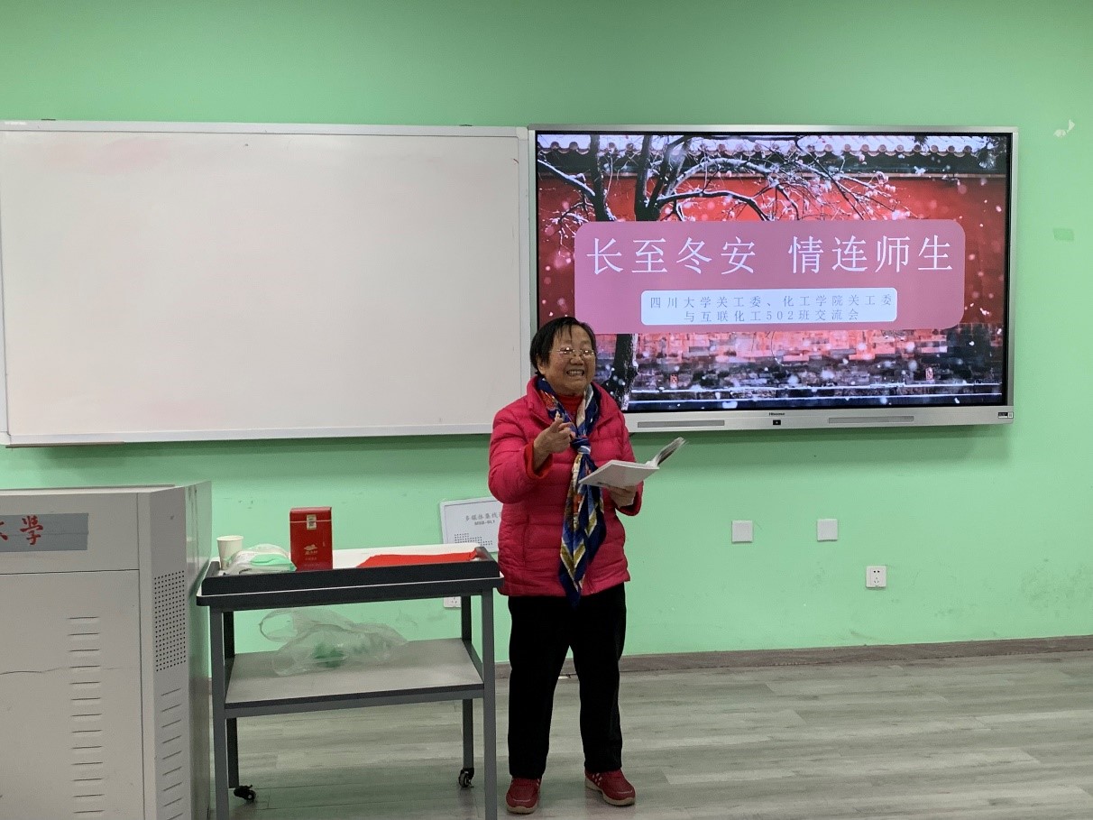2021年12月9日下午14:00,本着切实为同学们解决学习与生活中的问题的原则,校院两级关工委老教师们来到四川大学江安校区综合楼B座B107,与2021级化学工程学院互联化工2班全体同学一起,顺利开展了主题为“长至冬安,情连师生”的跟班关爱活动。