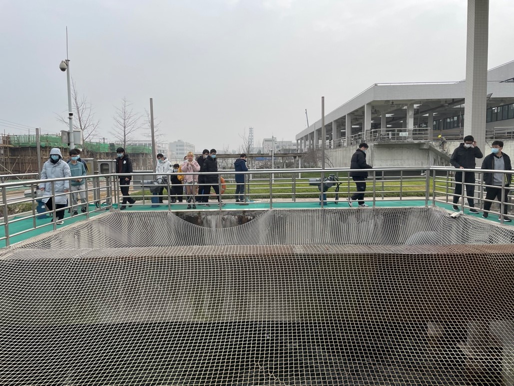 同学们来到厂区二号线进行现场学习,污水经过预处理后进入到A2/O生化池进行反应,结果二级生化处理,这个过程能利用微生物对COD、TN、TP等有机污染物进行去除,与我们专业内容联系紧密。