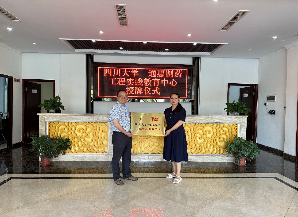 2023年6月27日上午10:00,“四川大学-通惠药业工程实践教育中心”揭牌仪式在峨眉山通惠制药有限公司隆重举行。通惠制药常务副总经理王晓玲、副总经理李兵、袁波、唐雪枫、四川大学化学工程学院副院长唐盛伟、制药工程专业负责人李延芳及承强老师参加了此次揭牌仪式。