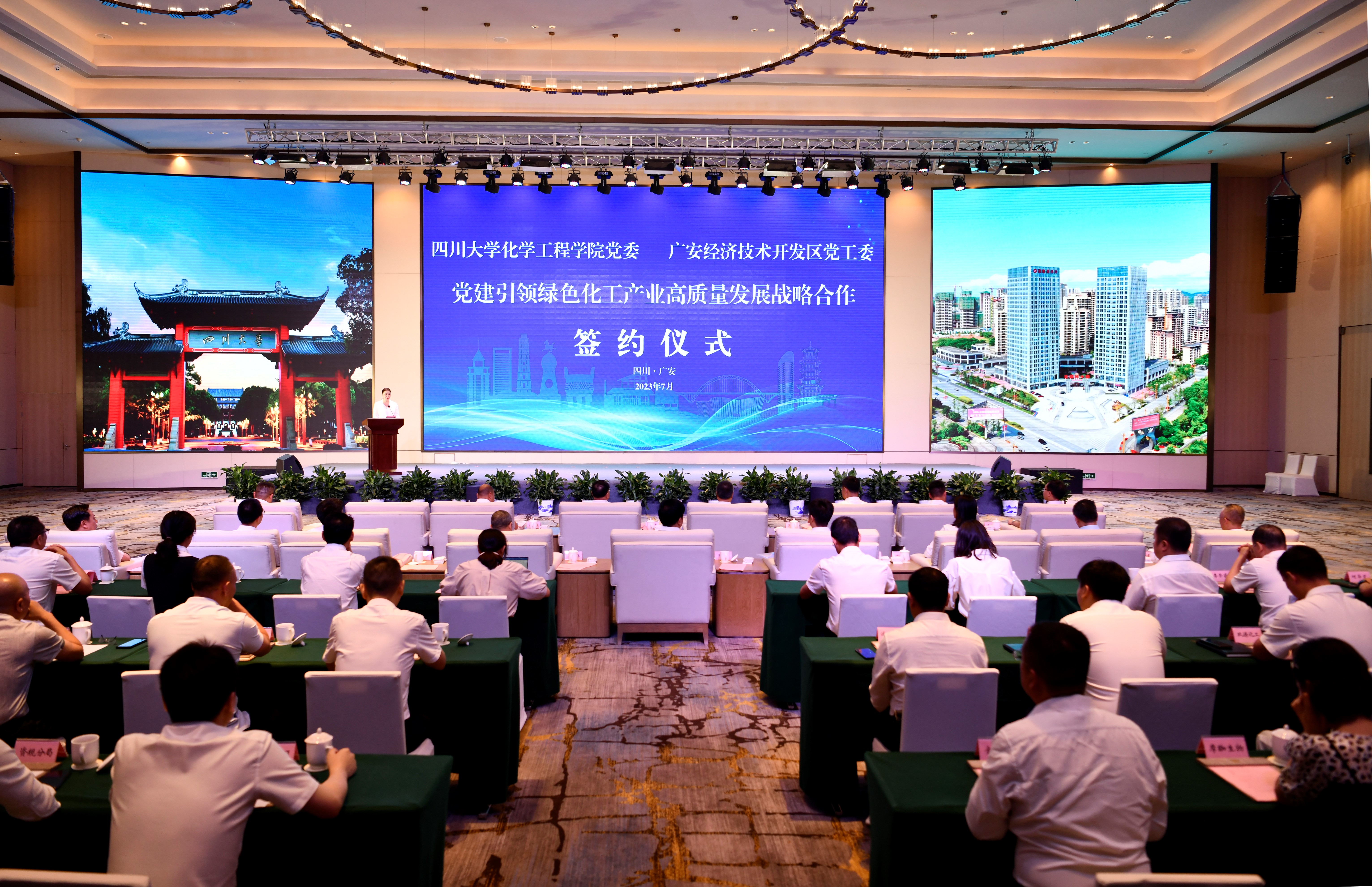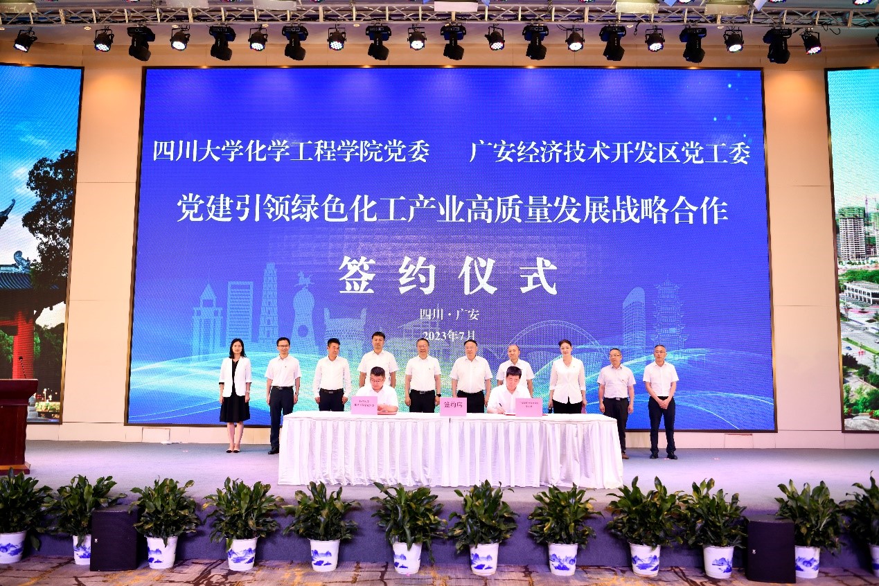 2023年7月5日,四川大学化学工程学院党委——广安经开区党工委党建引领绿色化工产业高质量发展战略合作签约仪式在广安举行。四川大学副校长梁斌,广安市人大常委会党组成员、副主任、广安经开区党工委书记杨世章,广安市副市长罗永平,化学工程学院党委书记李天友、院长郭孝东等以及广安经开区相关党政、各行业、企业家代表出席会议。签约仪式由广安经开区党工委副书记、管委会主任李婧主持。