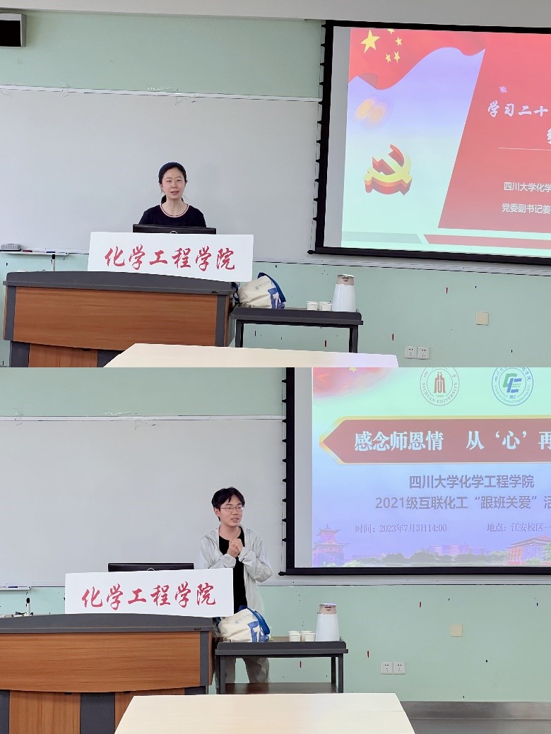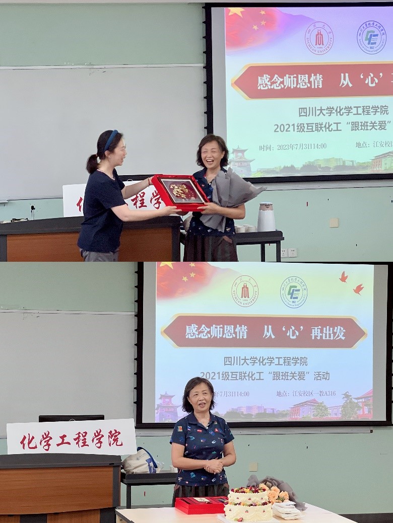 为鼓励当代青年继续坚定不移听党话、跟党走,深入了解学生学习生活情况,助力学生成长成才。2023年7月3日(周一)14:00-16:00,在江安校区第一教学楼A座316室,以“感念师恩情 从‘心’再出发”为主题的化学工程学院2021级互联化工“跟班关爱”活动暨李川娜老师荣休仪式顺利开展。与会人员有校、院关工委梁明征、付运清、候筑、李川娜、徐赐宁、余倩、魏永祉、秦自明、曹养书、朱立嘉、张慎语、李映发、刘蓉生、傅师申、成丽老师,化学工程学院党委副书记姜利寒老师,团委书记李珍珍老师,综合管理科科长杨谨瑗老师,互联化工502班班主任党亚固老师,辅导员付率老师,及2021级互联化工专业学生。此次活动由互联化工学生康骥扬主持。