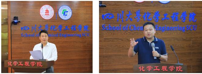 化学工程学院院长郭孝东(左)与杰出校友玉龙化工总工程师叶锐(右)进行新生致辞