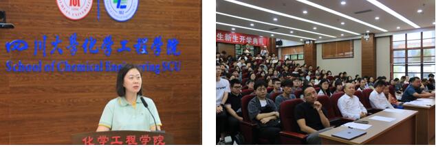 化学工程学院院长郭孝东同志进行新生致辞。郭院长首先对新生同学们表示热烈的欢迎,希望新生同学们能够尽快适应新环境,投入于科研工作中来;尤其提醒同学们要注意学术规范,切忌学术不端,害人害己;更要严格要求自己,做合格的化工人。杰出校友玉龙化工总工程师叶锐致辞,叶锐先生表示,一定要牢记“化工”的实用性,除了关注手头的实验,也要把目光放至长远,如何将手头的技术变为真正可用的、造福人民的实物,抱着这样的胸怀不断前行,前路一定会越来越开阔。