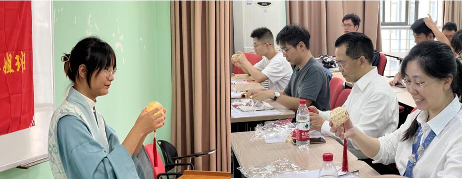 活动第三个环节,花雨同学现场示范竹编灯笼制作方式,在场师生携手体验,最终共同完成手工作品,师生共庆双节。