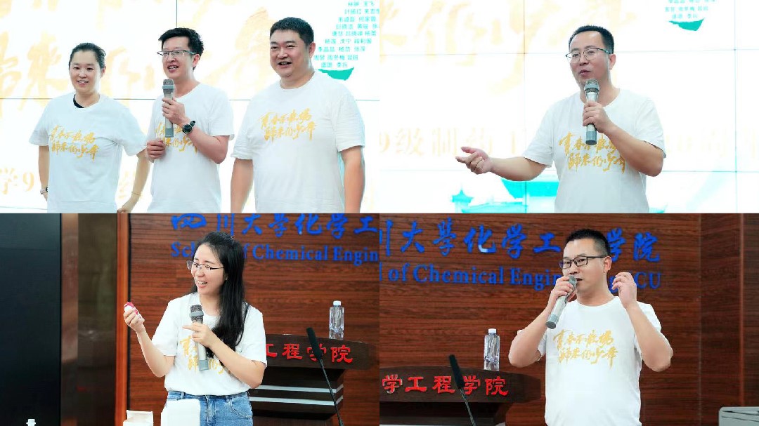 聚会第一站是在化工学院313会议室举办主题班会,这个教室也曾是24年前入校第一次举行班会的所在地。二十多年过去了,整个教室已经焕然一新,迎接了一届又一届的新生入校。主题班会首先由学院李德富副书记代表化学工程学院开场致辞,他表示学院欢迎毕业的同学们常回来看看。班会也邀请到了时任专业课教师的庞国伟、马丽芳、邓勇、李子成、承强、兰先秋六位老师,师生们在一起追忆往昔时光,共叙校园情谊,欢声笑语不断传出教室。在“2023问,2003答”这个互动环节里,师哥师姐们给目前在校的本科生代表对于就业还是深造等疑问一一耐心作答。班会的最后一个环节是亲子主题的“小药人”科普讲座,两位从事药物研发和生产的同学,通过视频和实物结合的方式,给到场的小朋友深入浅出的讲解了药品生产和上市的过程。