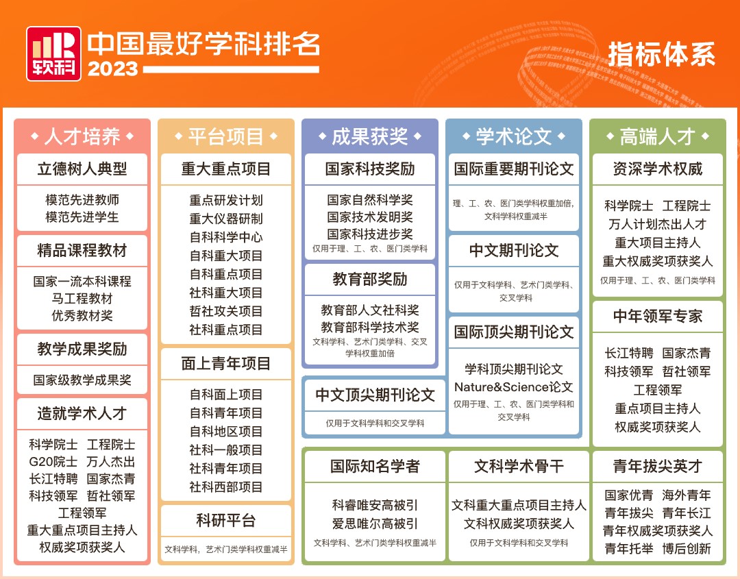 软科中国最好学科排名的指标体系包括人才培养、平台项目、成果获奖、学术论文、高端人才5个指标类别,下设18个指标,共计70余项反映学科竞争力的观测变量。排名数据全部来自第三方数据源,如教育部、科技部、国家自然科学基金委员会、国际和国内文献数据库等。