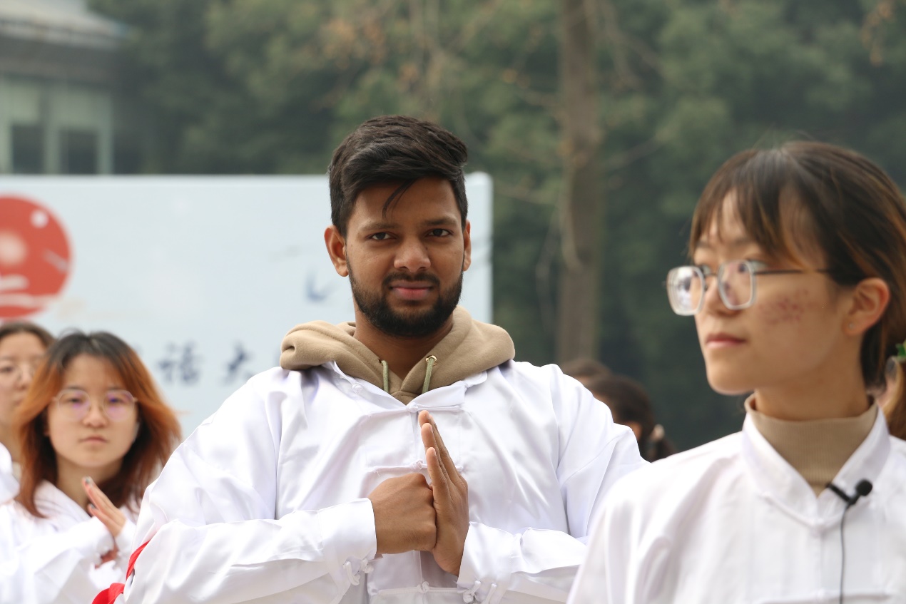 活动正式开始前,主持人首先致辞,向所有参与活动的老师和学生表示了热烈欢迎,并介绍了冬至节日和太极拳的起源和特点。之后,在教导员罗丽君老师的带领下,各位同学首先行抱拳礼。作为礼仪之邦,以左手抱右手,表示尊敬和谦虚,也符合太极阴阳平衡。随后,从起势开始,左右野马分鬃、白鹤亮翅、左右搂膝拗步……太极二十四式在老师口中娓娓道来。收脚、转身、弓步、分手……二十四招式不断打出。太极二十四式,每一式都具有丰富的内涵,从起势的“鹤立”姿势,展示太极拳的威严和内涵;到白鹤亮翅,展示舒展与收放,使整个身体得到充分的拉伸和放松;再到搂膝拗步,展示稳固的身体基础。每一式在老师的耐心教学引导下,都变得生动形象起来。各位同学身着白衣,一招一式如行云流水,身形飘逸若遇水蛟龙。每一式,都学的是那么认真,每一招,都挥洒有力,每一步,都在奋力向前。参与活动的留学生和港澳台学生眼睛被老师的动作吸引着,手脚跟随老师不断挥舞,未有一丝懈怠。在休息的时候,还热切的和旁边同学讨论起来,讨论中间的某些细节性动作,在同学们耐心细致的讲解下,他们的动作也更加娴熟起来。他们学习的热情也感染了来来往往的同学们,引得不少同学驻步观看,甚至还有不少同学也加入了他们的行列,在旁边一起学了起来。