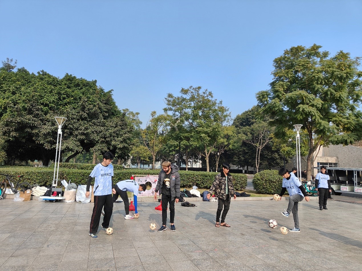 “发展体育运动,增强人民体质”,毛主席在1952年的题词,为新中国体育事业指明了发展方向。今年,是毛主席诞辰130周年,为了以实际行动向毛主席致敬,同时展现当代大学生的精神风貌。2023年12月26日,化学工程学院和国际合作与交流处在四川大学江安校区青春广场共同举办了“踢动千年传统文化,感受蹴鞠和毽子的魅力”活动,来自多个学院的留学生、港澳台学生、本硕博近百名学生和老师们共同参与了此次活动。