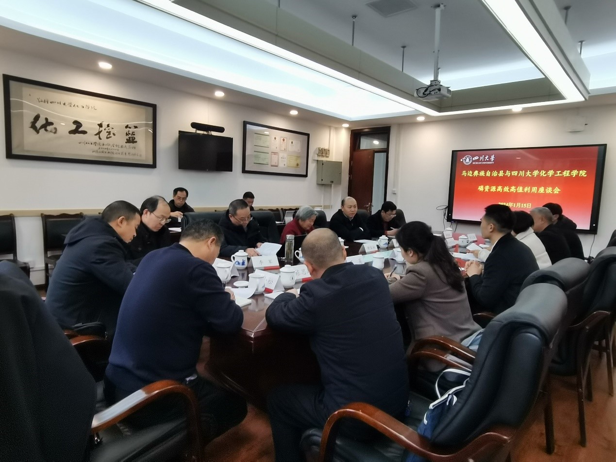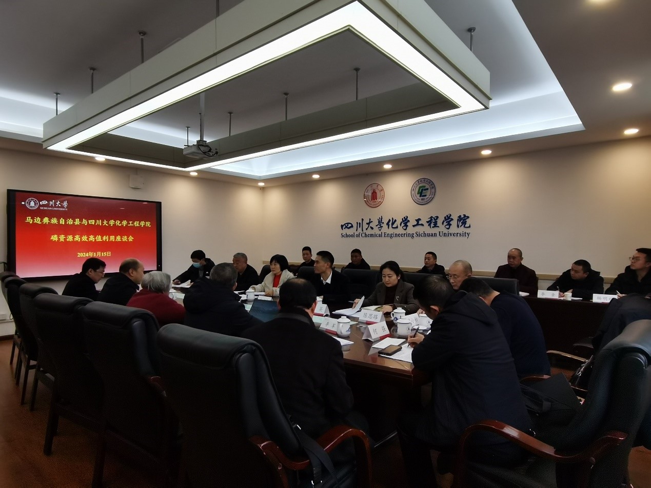 2024年1月15日下午,在四川省经济合作局经济合作三处副处长龙晓琳的组织下,马边彝族自治县托底性帮扶工作专班成员,马边彝族自治县委常委、统战部部长余立文带队一行13人来我院进行座谈交流。四川大学杰出教授钟本和,化学工程学院党委书记李天友、副院长唐盛伟、党委副书记兼纪委书记李德富,王辛龙教授、李军教授等磷化工团队教师参加会议。会议由李天友书记主持。