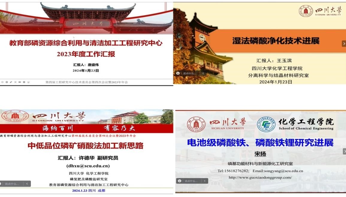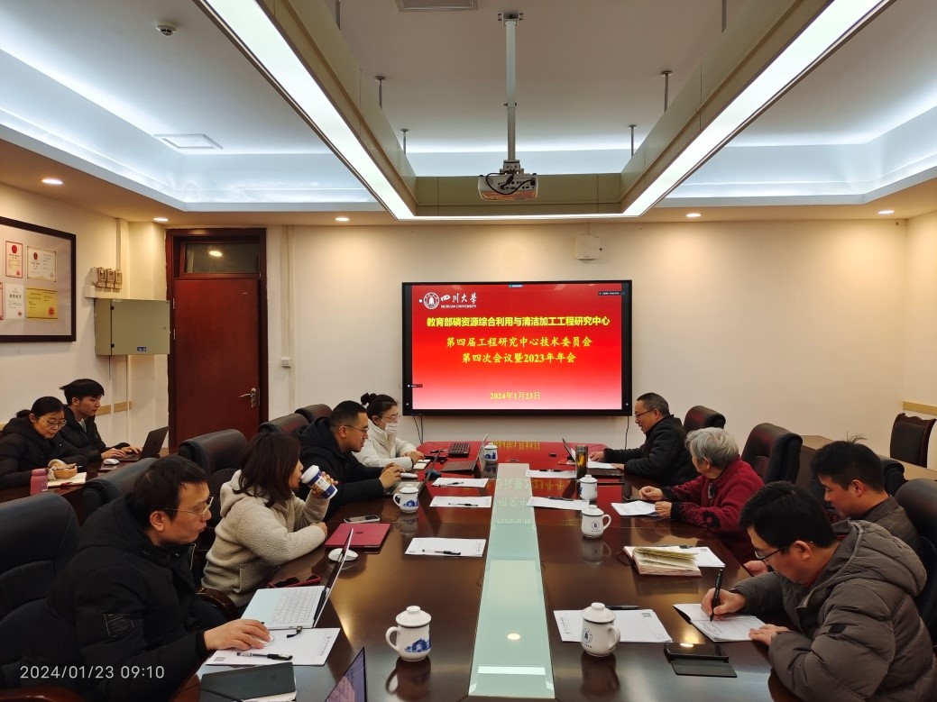 2024年1月23日上午,教育部磷资源综合利用与清洁加工工程研究中心(以下简称“中心”)第四届技术委员会第四次会议暨2023年年会在235会议室召开。会议以线上线下相结合的方式进行。四川大学杰出教授钟本和先生、四川大学化工学院院长郭孝东教授出席会议并讲话。中国科学院院士、中心技术委员会主任委员、宁波大学赵玉芬教授,中心技术委员会委员中国石油和化学工业联合会胡迁林副秘书长,中国磷复肥工业协会修学峰理事长,华东理工大学化工学院于建国教授,中科院过程所李会泉研究员,清华大学骆广生教授,昆明理工大学梅毅教授,中国农业科学院农业资源与农业区划研究所赵秉强研究员,郑州大学生态与环境学院院长汤建伟教授,四川大学新能源与低碳技术研究院院长梁斌教授等技术委员会委员,以及中心部分教师骨干等共计40余人参加了会议。会议分为开幕式和委员会会议两个环节,分别由中心主任、化工学院副院长唐盛伟教授和中心技术委员会委员四川大学王辛龙教授主持。