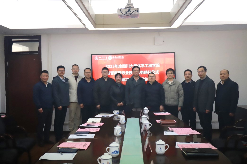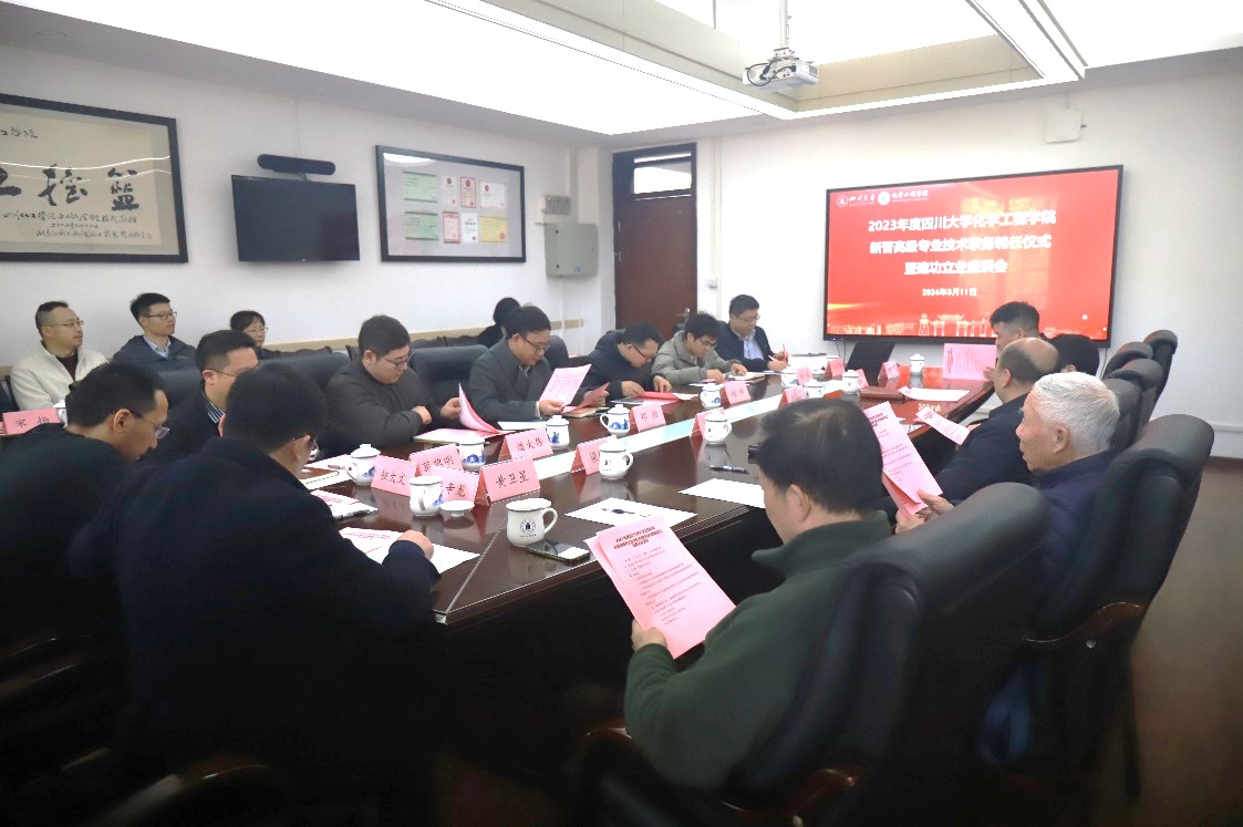 3月11日,学院在望江校区化工楼举行2023年度新晋高级专业技术职务聘任仪式暨建功立业座谈会。四川大学副校长游劲松出席会议并讲话。学院党委书记李天友、院长郭孝东、副院长钮大文、副书记兼纪委书记李德富,学院教授委员会主任王辛龙、教学指导委员会主任黄卫星、教学督导组组长谢川、关工委副主任梁明征,以及新晋高级专业技术职务全体教师参加会议。李德富主持会议。
