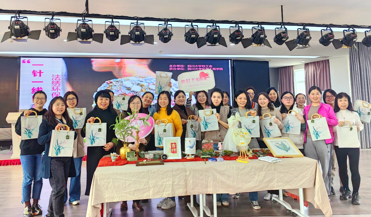 化学工程学院工会承办的“一针一线皆关情”工会女职工女性魅力展示系列主题活动之法式刺绣品鉴和手提包制作活动于3月13日下午在文华中心六楼多功能厅顺利举办,活动吸引了来自校内多个单位60余位女职工的热情参与。校工会王蕾、杨秀建等老师也来到活动现场,全程组织参与。