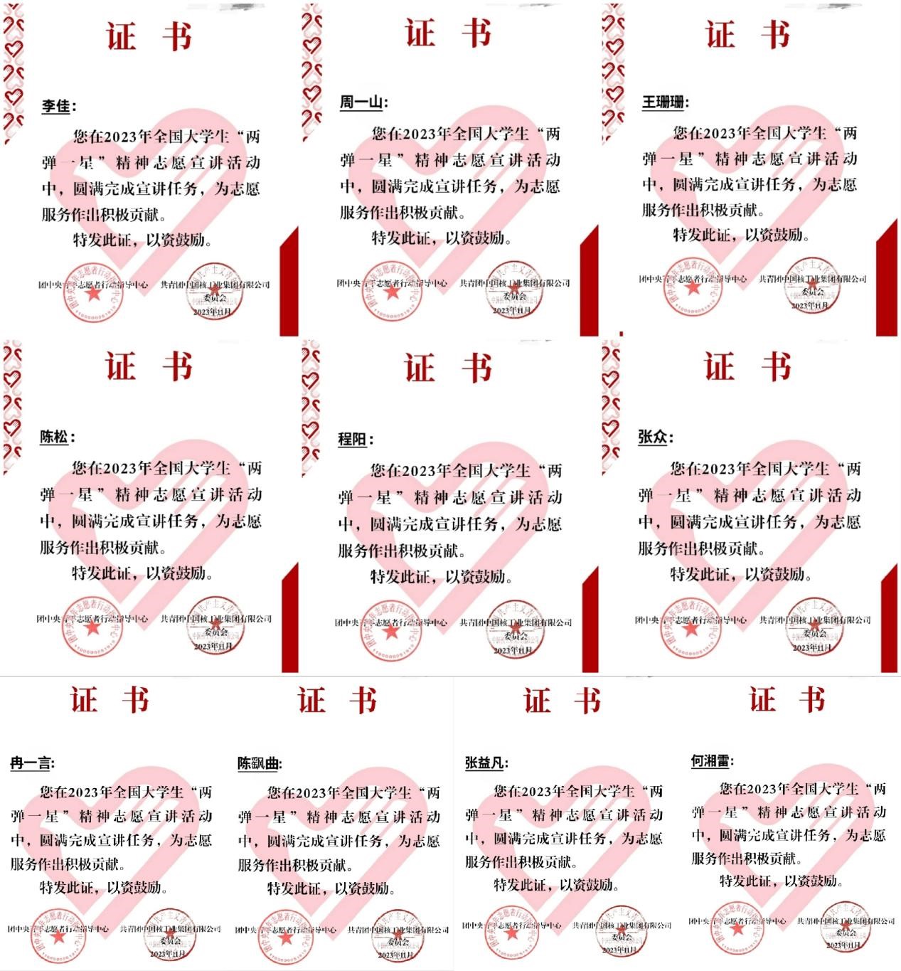 为深入学习宣传贯彻习近平新时代中国特色社会主义思想和党的二十大精神,落实“强国复兴有我”群众性主题宣传教育活动相关要求,引导动员青年学生大力弘扬“两弹一星”崇高革命精神,四川大学化学工程学院“青鸟”青年志愿宣讲团,作为全国1000支“两弹一星”精神志愿宣讲服务队,在2023年积极报名并圆满完成了由团中央青年志愿者行动指导中心、中国核工业集团有限公司联合开展的2023年度“两弹一星”精神志愿宣讲活动,并获评全国百个“优秀团队”。