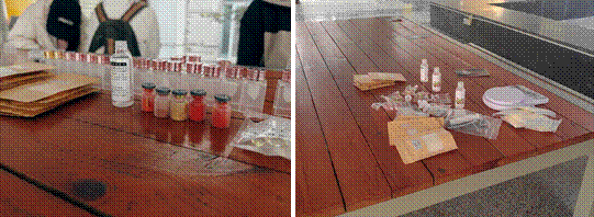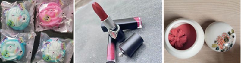 体验者制作的成品(从左到右依次为药皂、口红、胭脂)
