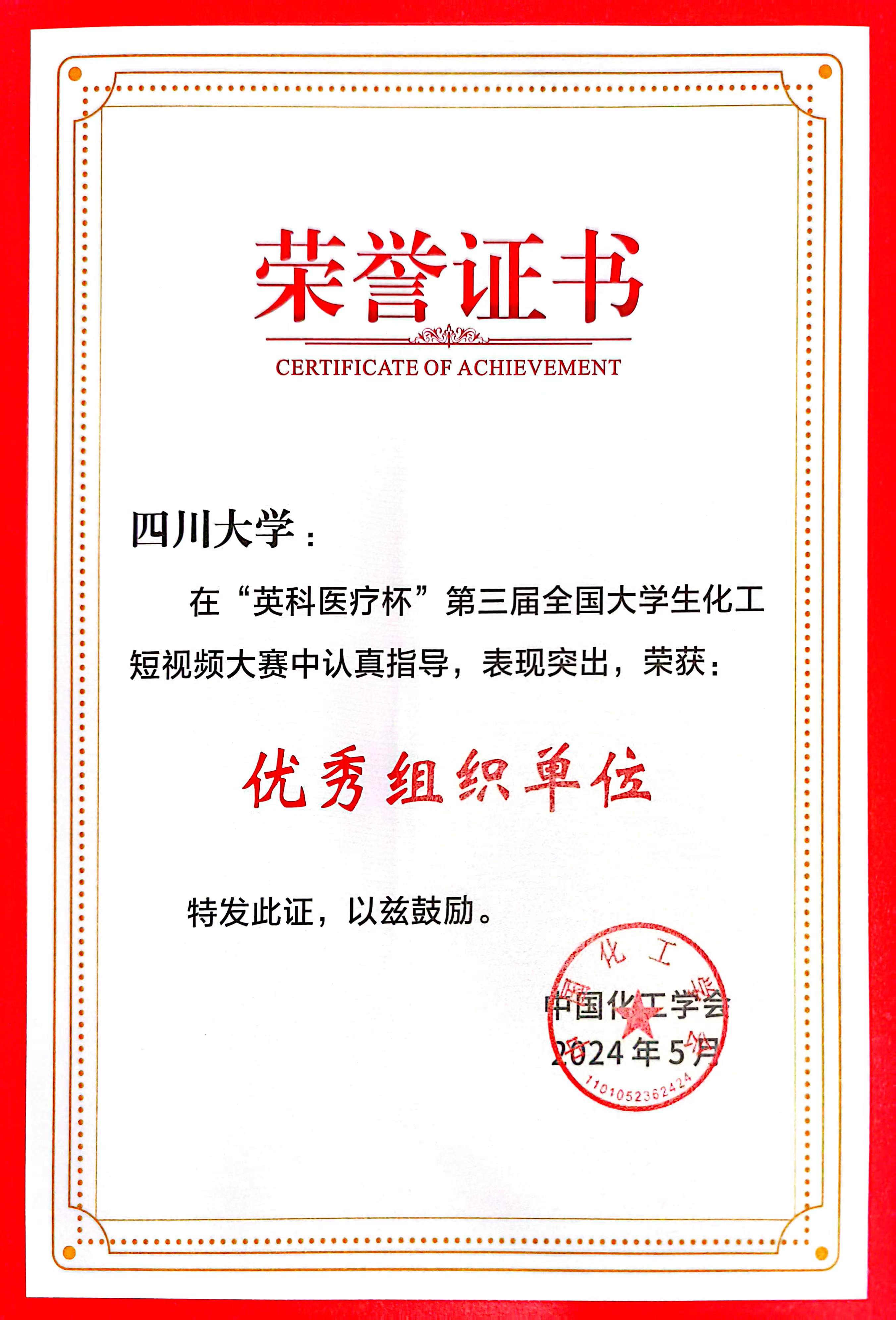 由中国化工学会主办的“英科医疗杯”第三届全国大学生化工短视频大赛评审工作已圆满结束。在本次大赛中,四川大学化学工程学院表现卓越,成绩显著。