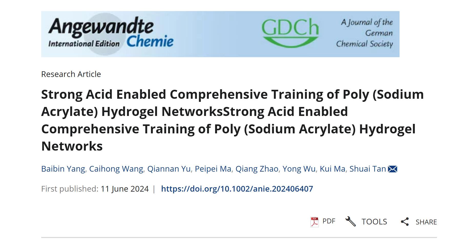 近日,我院谭帅副教授开发了一种强酸耦合机械训练实现聚丙烯酸钠水凝胶综合性能强化的新策略。通过将聚丙烯酸钠水凝胶浸入4 M H2SO4溶液中,强酸溶液耦合机械训练会促使聚丙烯酸钠网络逐渐转化为聚丙烯酸网络,从而形成丰富的动态氢键相互作用。氢键作用赋予了酸浸泡的聚丙烯酸钠水凝胶出色的抗溶胀和自愈性能,并显著提升了其机械性能。相关工作以“Strong Acid Enabled Comprehensive Training of Poly (Sodium Acrylate) Hydrogel Networks”发表在《Angewandte Chemie International Edition》。
