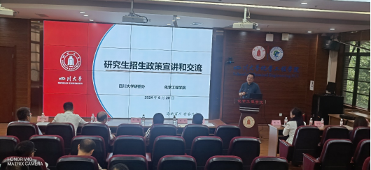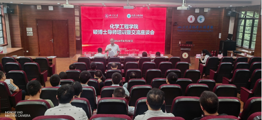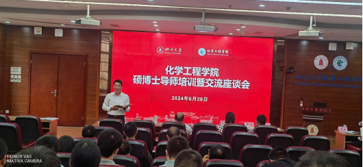 2024年6月20日下午,化学工程学院在望江校区化工楼313会议室举行硕博士导师培训及交流座谈会。学校研究生院招生办公室刘猛、研究生院招生办公室李洁科长、研究生院培养教育办公室黄云科长受邀出席活动。学院党委书记李天友、院长郭孝东、党委副书记兼纪委书记李德富、党委副书记姜利寒及硕博士导师50余人参加活动。会议由副院长谢锐主持。