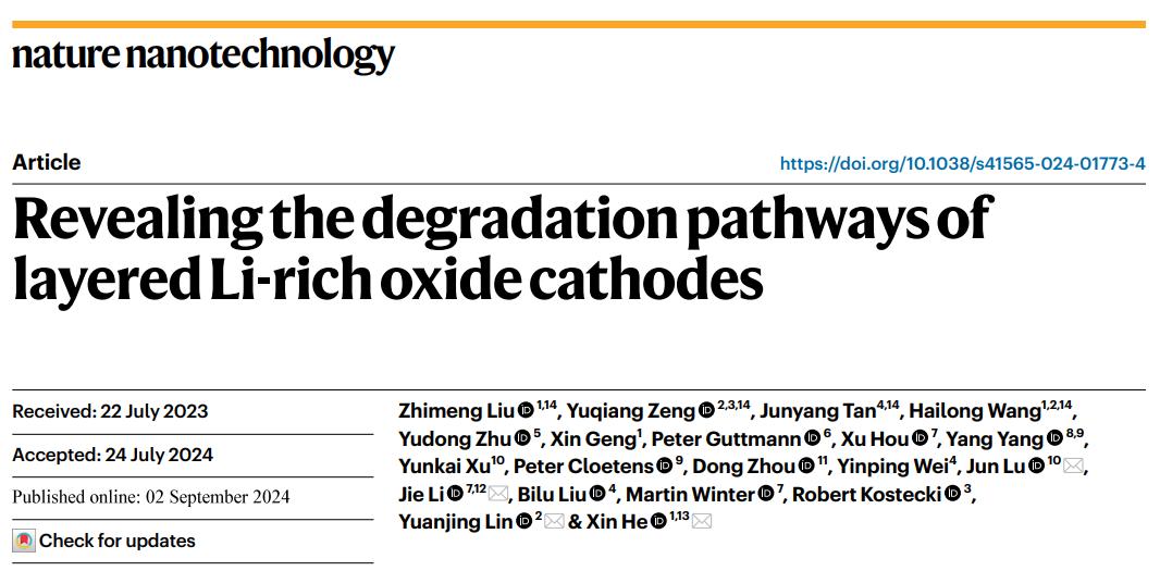 近日,我校化学工程学院何欣研究员团队在国际知名期刊Nature Nanotechnology上发表题为Revealing the degradation pathways of layered Li-rich oxide cathodes的研究文章。通过整合形貌、结构和从单个原子的氧化态演化到次级颗粒的分析,经过纳米尺度到微尺度的表征,确定了与颗粒内非相反应相关的不同结构变化途径。