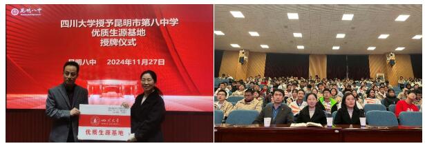 傍晚,招生工作组来到了昆明市第八中学。谢锐副院长代表四川大学为昆明市第八中学授予了“四川大学优质生源基地”称号。欧阳李科老师向现场师生详细介绍了四川大学基本情况和招生政策等。在互动问答环节,同学们积极发言,招生工作组对同学们的疑问进行了一一解答和细致指导,鼓励同学们努力学习、积极报考川大,争取都能进入自己心仪的专业。