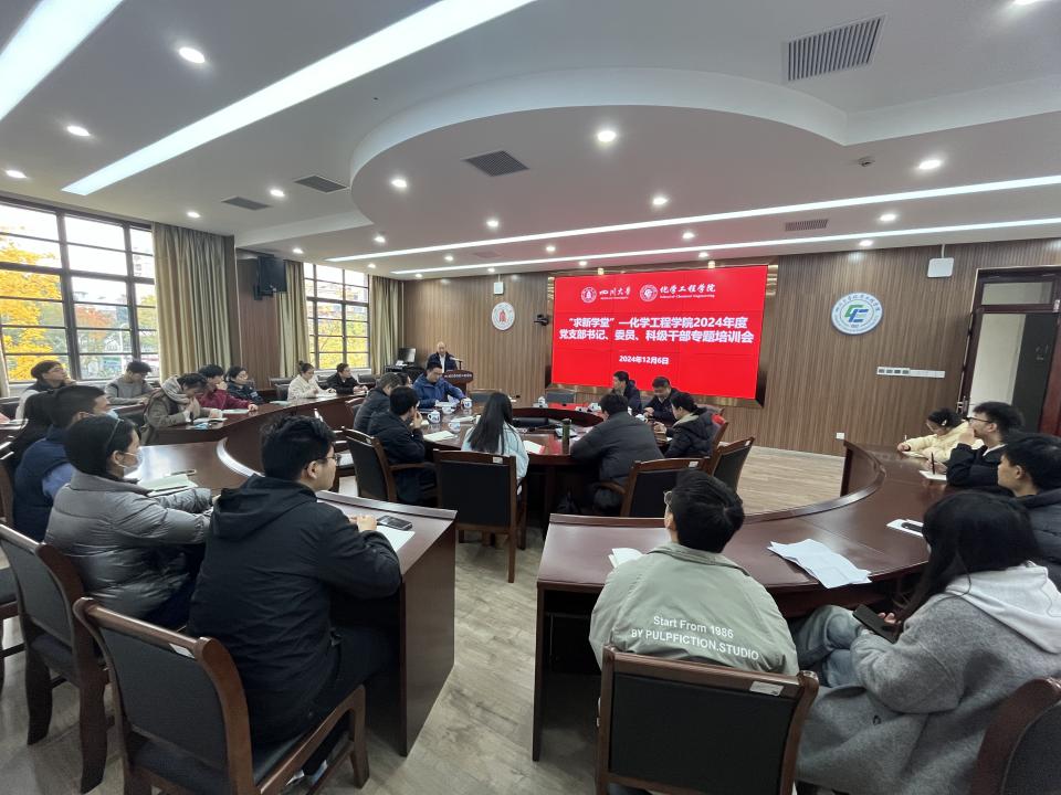 为深入学习贯彻党的二十届三中全会精神和全国教育大会精神,持续推进“三个一流”创建活动,化学工程学院面向全体支部委员、科级干部开展系列专题培训。12月6日,第三期专题培训在望江校区化工楼312会议室举办。本期培训由校党委组织部副部长苏德强主讲,学院党委书记李天友、党委副书记兼纪委书记李德富以及全体党支部委员和科级干部等参加培训会。李天友主持会议。