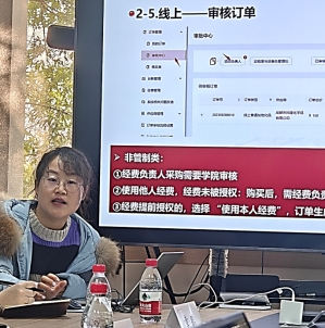 首先,学校实验室及设备管理处赵邱越老师及曾静老师分别就新平台的研制背景、流程一站式的优越性、接驳财务结算功能及危化品全周期全流程监控与管理等方面进行了宣讲,演示了新平台的系统操作全流程步骤,并重点强调了学校对危化品、气瓶等管制类实验物资须经新平台采购的要求。运维工程师就新平台中危化品使用台账的上传及维护、经费授权等系统操作进行了培训。