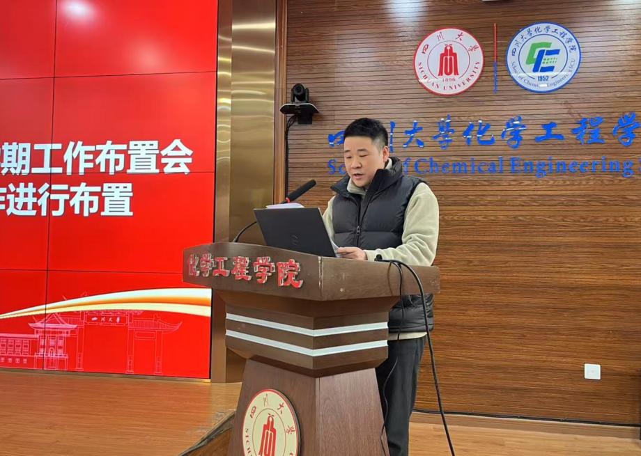 学院院长郭孝东布置年度工作。郭孝东指出,2025年是贯彻全国教育大会精神、落实教育强国建设规划纲要的关键之年,是“十四五”收官和“十五五”谋划之年,也是学校和学院加快推进高质量发展的抓落实之年。全院师生要以钉钉子精神狠抓工作落实,加快建设一流化工学院。牢记立德树人根本任务,坚持“三全育人”“五育并举”,组织开展好本科教育教学大讨论和本科教学评估工作等,加强研究生培养,全面提高人才自主培养质量。弘扬和践行教育家精神,持续抓好青年教师的培养,全面落实学院支持青年教师发展12条举措,对标国家战略方向和学科发展重点,加大引才和内培工作力度,着力打造高水平的师资队伍。加强有组织的科研,支持“双高计划”团队做大做强,推进高水平科技自立自强。发挥学科优势,积极参与学校“登高计划”“进军计划”,组织与四川省地市州和龙头企业的战略合作,着力提升社会服务力贡献力。统筹高水平“走出去”和“引进来”,吸引更多优质生源来院留学,主办、承办好大型学术会议。推进体制机制改革,持续完善一流服务保障体系,全力护航校园安全稳定。坚持以高质量党建引领高质量发展,扎实推进各项工作落地见效。