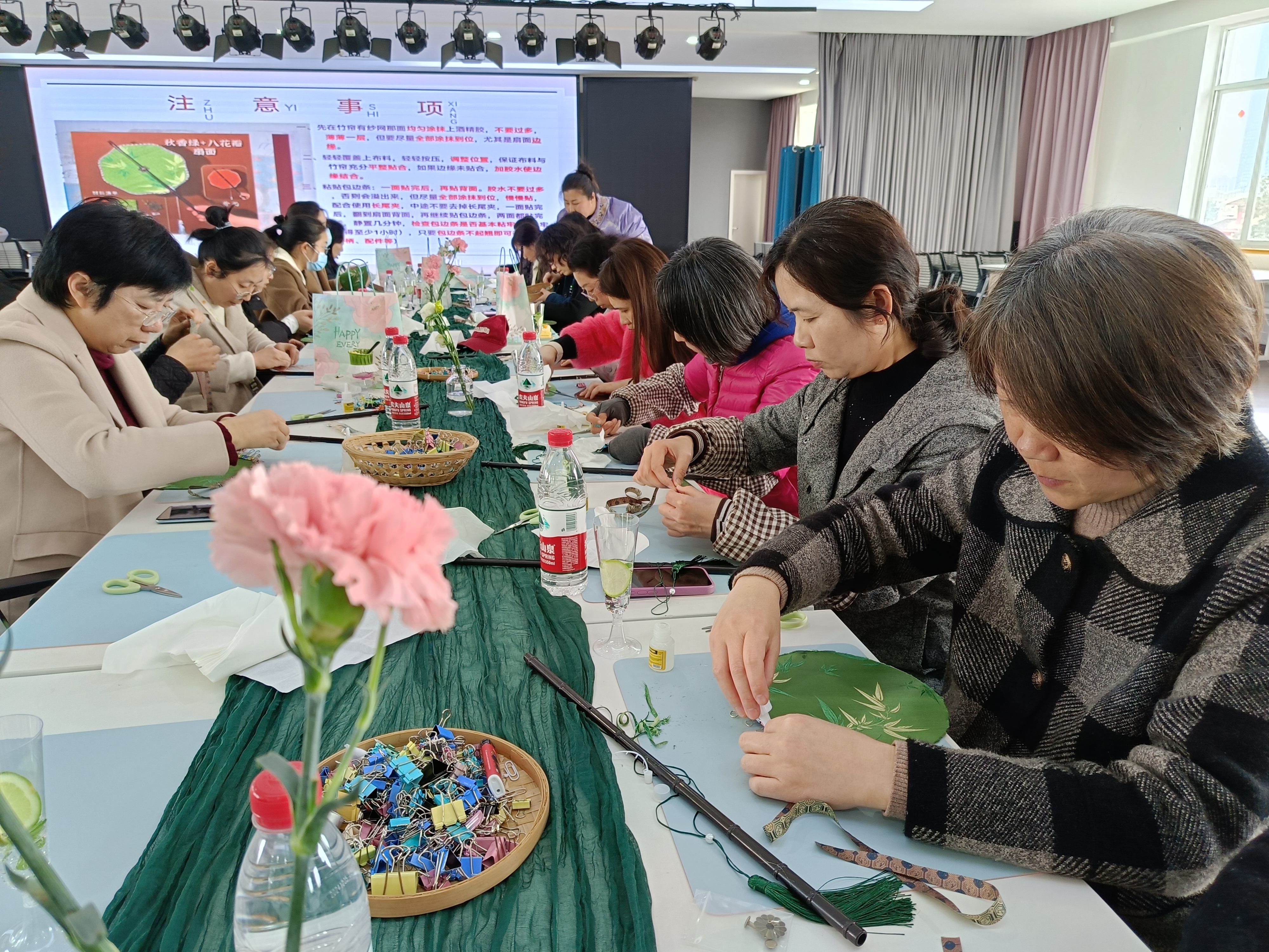 在制作环节,老师们充分发挥想象力和创造力,互相交流制作技巧,分享创作灵感,现场气氛温馨欢乐。经过一个多小时的精心制作,一把把独具匠心的团扇逐渐成形,每一把都凝聚着老师们的智慧与创意。