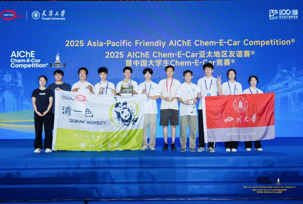 2025年8月10日至11日,由中国化工学会主办的第九届“AIChE Chem-E-Car亚太地区友谊赛暨中国大学生Chem-E-Car竞赛”于天津大学成功举办。我院学生黄小峰、赵国江、刘庭锐、周俊竹、刘霞、赵思佳、杜天翔代表的“四川大学清一色车队”,在本次赛事的37支国内外队伍中勇夺桂冠,成功摘得性能竞赛特等奖,吴振国老师、王缘老师获得“优秀指导教师奖”。