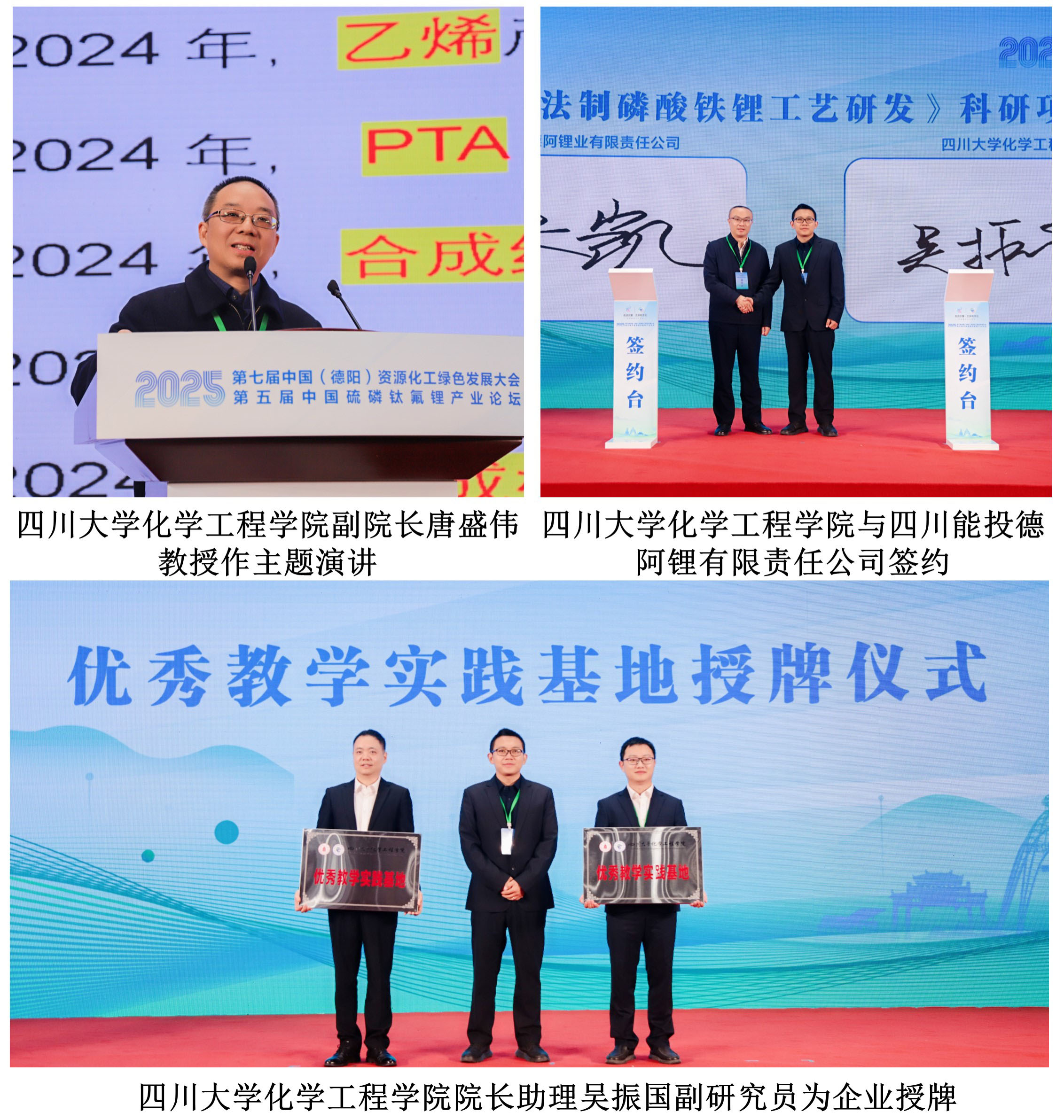 开幕式上,四川大学化学工程学院副院长唐盛伟教授作了《化工产业现状与未来发展趋势》主题演讲,四川大学化学工程学院与四川能投德阿锂业有限责任公司签订了合作协议,并向龙佰四川钛业有限公司、四川龙蟒磷化工有限公司授予“优秀教学实践基地”称号。