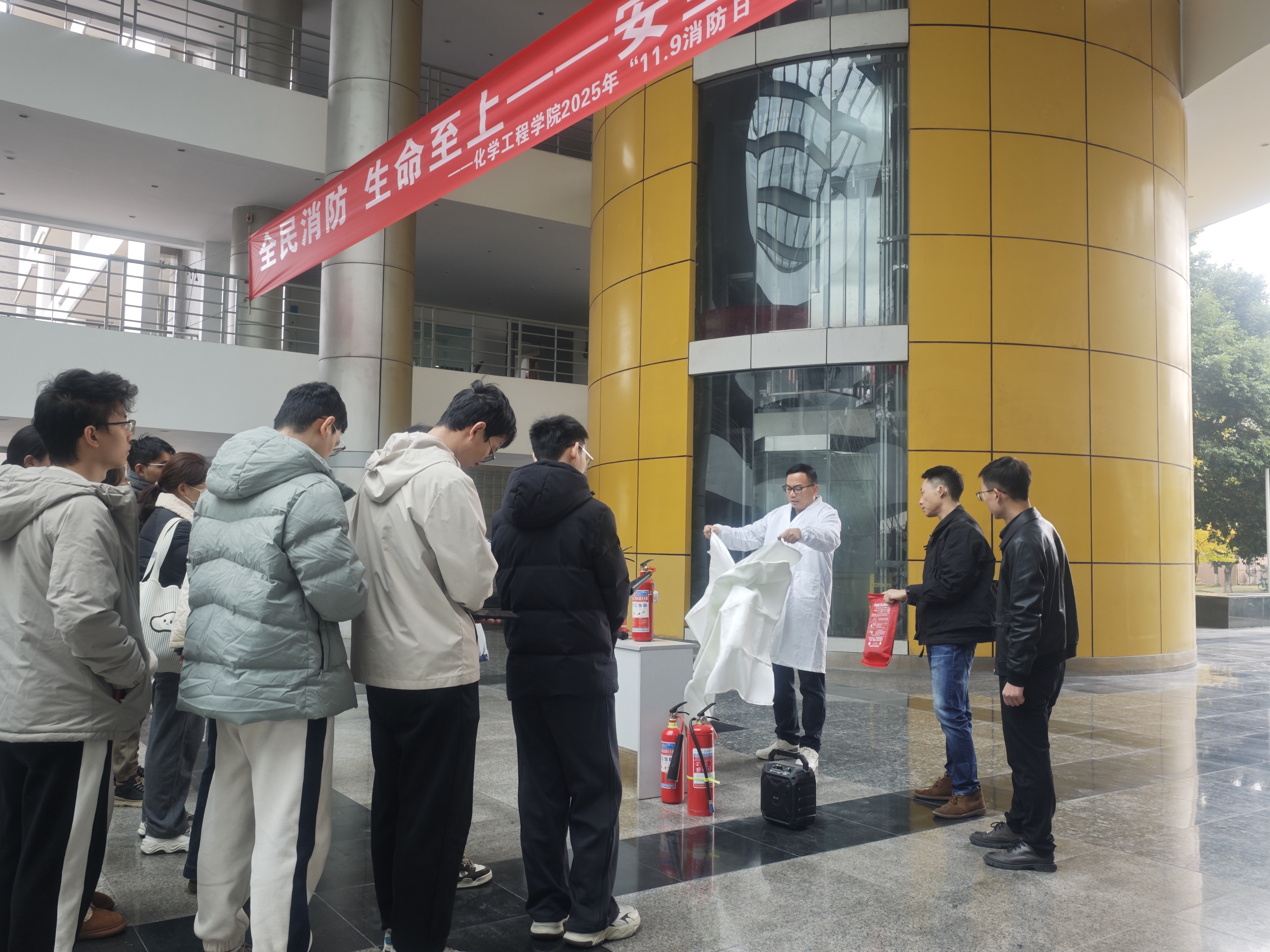 为落实2025年全国“消防宣传月”活动精神及学校保卫处活动通知,切实增强学院师生消防安全意识,提高初起火灾应急处置能力,四川大学化学工程学院于2025年11月21日上午9:30在江安校区一基楼开展了119消防日安全用火用电宣传教育培训与演练活动。化学工程学院李天友书记,王袁隆老师、胡毅老师等学院消防安全相关负责人、第三方安全服务公司工作人员以及望江、江安两个校区各个课题组实验室兼职安全员和相关负责人参加了本次活动。