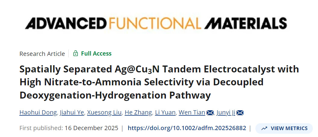 近日,化学工程学院吉俊懿教授团队在《Advanced Functional Materials》期刊发表了关于硝酸根还原高性能串联电催化剂设计的研究论文“Spatially Separated Ag@Cu3N Tandem Electrocatalyst with High Nitrate-to-Ammonia Selectivity via Decoupled Deoxygenation-Hydrogenation Pathway”。硕士研究生董浩辉为论文第一作者,吉俊懿教授和田文高级实验师为论文共同通讯作者,我校为论文唯一通讯单位。