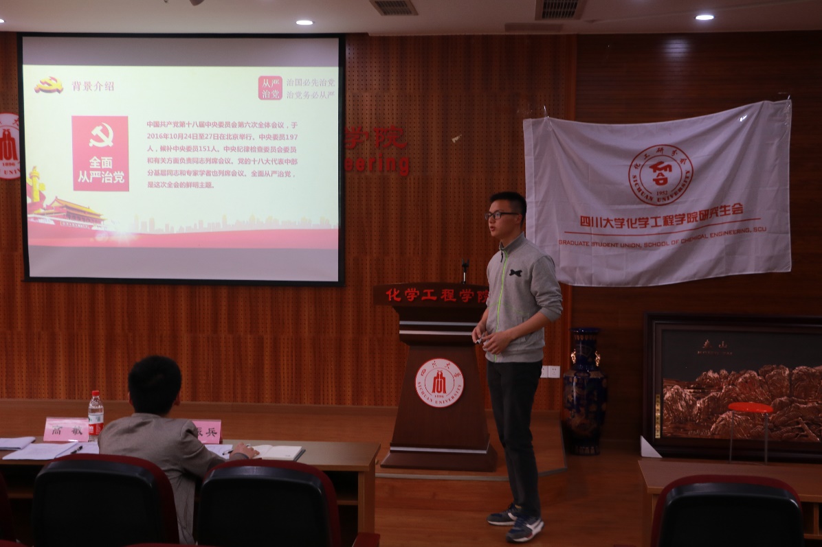 为深入推进学校党风廉政建设,化学工程学院于4月在全院开展党风廉政建设教育宣传月活动。由化学工程学院党委主办、化学工程学院研究生分会承办的“化学工程学院党支部学习之党风廉政建设专题PPT制作与宣讲大赛”于2017年4月25日下午14:30在望江校区化工楼313报告厅举办。本次活动的评委嘉宾有化学学院党委陈晓东副书记、党政办主任李晓燕老师、高敏老师和研究生辅导员司振兵老师。化学工程学院研究生及本科各个学生党支部的党员代表参加了这次大赛。