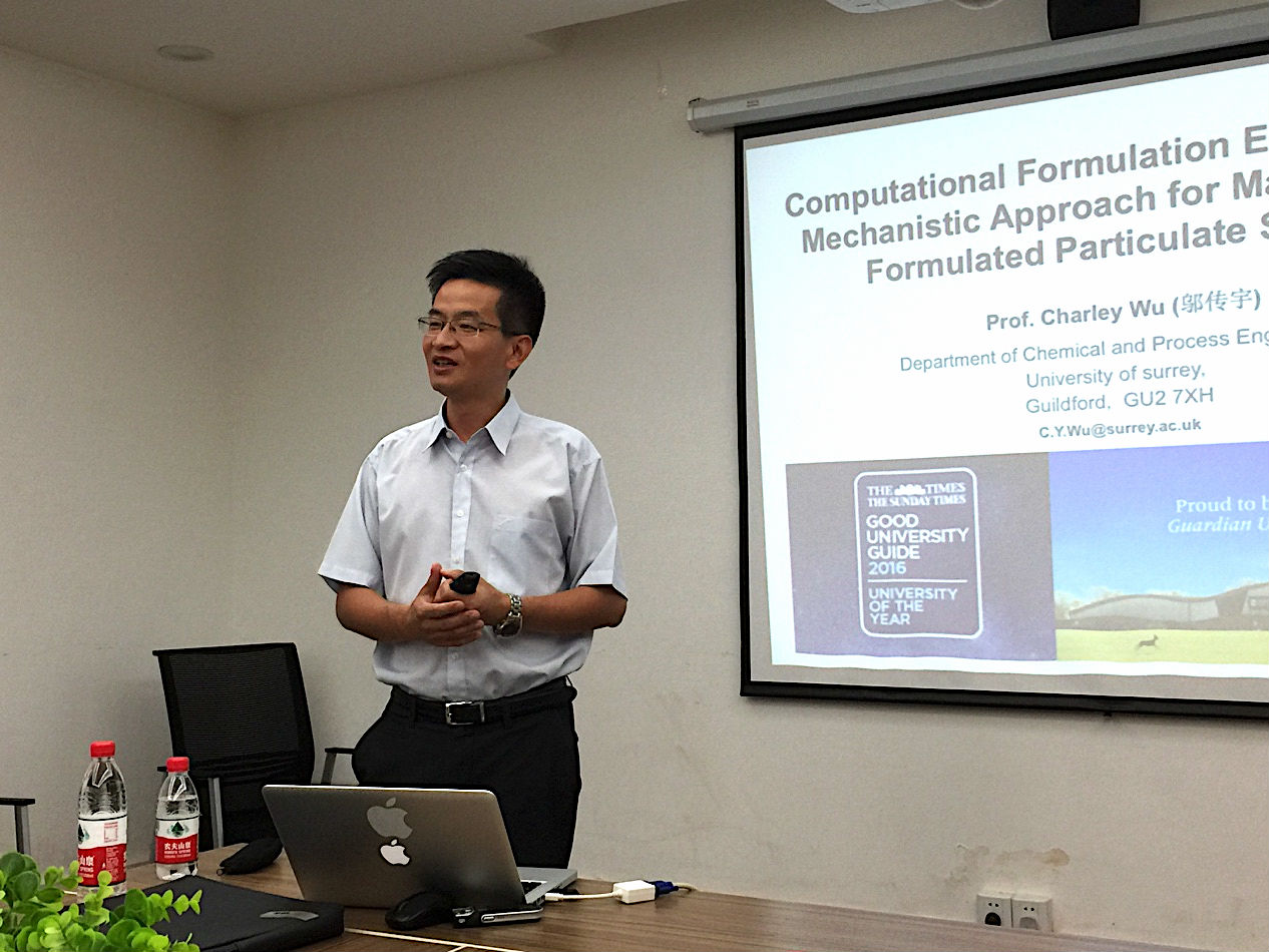 2016年8月15日上午10点,英国萨丽大学(University of Surrey)Charley Wu 教授应邀在化工学院227会议室为我院师生作了题为“Computational Formulation Engineering: A Mechanistic Approach for Manufacturing Formulated Particulate Systems”的学术报告,本次报告会由化工学院院长褚良银教授主持。