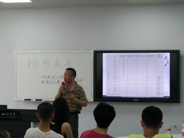 2016年6月9日下午两点,“畅想未来——考研及找工作经验分享会”,即校、院关心下一代工作委员会(后简称“关工委”)在化学工程学院2013级制药工程专业2班开展的“跟班关爱学生成长教育实践”系列活动之一,在江安校区综合楼B座306教室举行。与会的有关工委梁明征老师、付运清老师、郭明秀老师、李维俊老师、秦自明老师、万国荣老师、谢茂农老师、徐怡老师、杨传云老师、张卫红老师、曾志源老师、赵雪琴老师、侯筑老师,制药2班班主任赵刚老师、化工学院教导员李川娜老师,辅导员喻可乐老师,以及制药2班的全体同学。