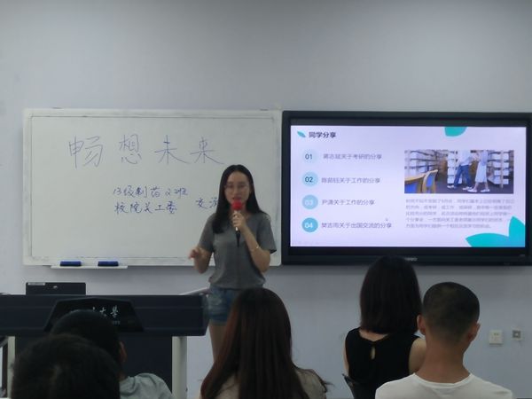 当日阳光明媚,教室里也是热度不减。6月9日,是高考的最后一天,时隔三年,同学们再次站在了人生的岔路口——主持人用风趣幽默的语言借古喻今,简述了如今同学们在面临“升学or就业”人生选择时的种种烦恼与感触,拉开了本次“畅想未来”经验分享会的序幕。在隆重介绍了到场嘉宾后,交流会正式开始。首先,制药2班的班主任赵刚老师上台致辞,客观、专业地为分析了制药行业发展前景,同时也对想要继续深造的同学们提出了十分宝贵的意见。这都让同学们激动不已、对未来更加充满希望!辅导员喻可乐老师以真实数据为依托介绍了近几届制药专业的就业情况及去向,展示了至今为止13级同学们大致的人生规划情况。随后,活动进入了重要的分享交流环节。共有四名同学分别就自己的相关经验进行了总结分享,与老师、同学进行了热烈的交流。