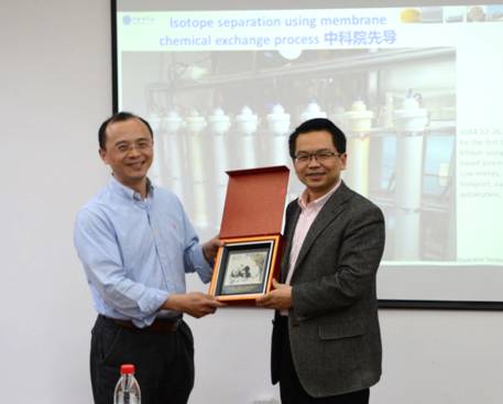 首先,何涛研究员简单介绍了自己实验室的基本情况。随后,他从正渗透的原理出发,详细地给大家介绍了他们实验室对于正渗透膜应用于饮用水处理、锂同位素分离、页岩气废水处理等最新研究进展。最后,何涛老师对膜技术应用于水处理做了宏伟的展望——移民火星。报告引起了老师同学们的浓厚兴趣。结束后,在座的老师及同学们与何涛研究员就正渗透膜在能源、食品和饮用水等方面的应用问题展开了讨论,何涛研究员以严谨求实的学术态度、浅显易懂的方式解答了老师和同学们的疑惑,并且给老师和同学们留下了深刻的印象。
