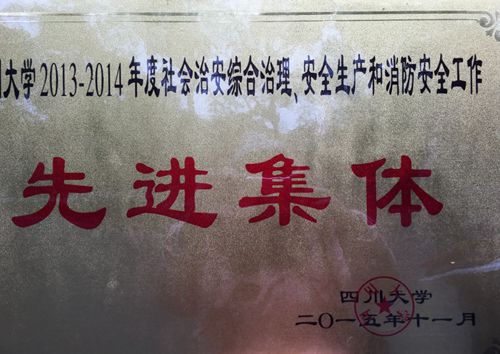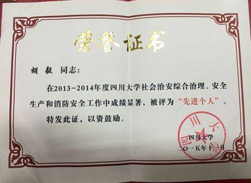 此次表彰大会上,化学工程学院荣获“四川大学2013-2014年度社会治安综合管理、安全生产和消防安全工作先进集体”,学院胡毅老师获得年度先进个人,甘攀学、王玉柱等9名学生获得学生先进个人。