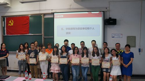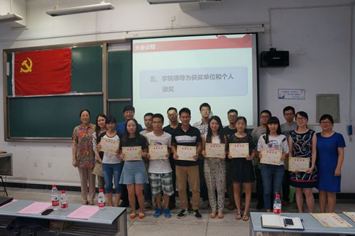 随后,庞国伟书记带领全体2015年新发展党员举行入党誓言。院分团委书记姜利寒老师宣读了《化学工程学院关于表彰2013--2015年度先进党支部、优秀共产党员和优秀党务工作者的决议》,通报了学院单位和个人受表彰情况。各位领导为获得先进党支部和优秀个人颁奖。