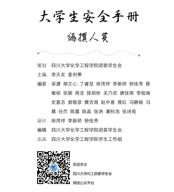 春回大地,万物复苏,大自然呈现出一片欣欣向荣的景象。本学期开始之际化学工程学院的全体同学收到了一份贴心的礼物——《大学生安全手册》。本书由四川大学化学工程学院学生工作组出品,化学工程学院团委学生会策划编辑。