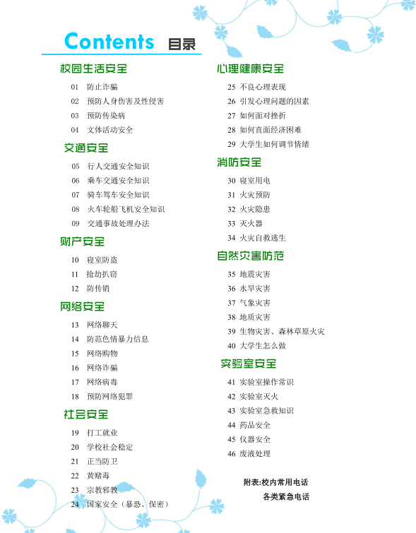《大学生安全手册》包括了:校园生活安全、交通安全、财产安全、网络安全、社会安全、心理健康安全、消防安全、自然灾害防范、实验室安全等九大板块。详尽地说明了各类安全隐患、安全问题以及自然灾害,并相应介绍了各方面的安全知识,应对、处理办法。
