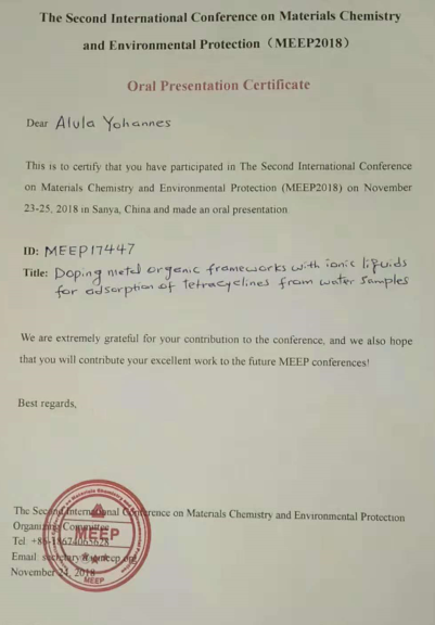 2018年11月23日~11月25日,第二届材料化学及环境保护国际会议(2ndInternational Conference on Materials Chemistry and Environmental Protection)于中国三亚顺利召开。我院制药工程专业三年级博士研究生Nigussie Alula Yohannes(埃塞俄比亚籍)出席该会议并于大会上作题为“Doping Metal Organic Frameworks With Ionic Liquids For Adsorption Of Tetracyclines From Water Samples”的研究报告。本次会议吸引了众多来自材料化学、分离科学、化学工程及环境工程等不同研究领域的研究员、科学家、工程师和学者,是我院学子和国内外相关领域专家面对面交流的难得机会。埃塞俄比亚被称为“东非水塔”,但普遍存在的污染问题尚未得到有效控制;环境水资源中的药物残留一直是影响和危害埃中两国乃至全球大众生命健康的重要问题,该研究立足化学工程领域的学科热点,将金属有机骨架材料与绿色溶剂离子液体相结合,为埃中两国代表性的河流湖泊样本建立了科学、有效、可行的四环素类成分回收新方法,具有显著的社会意义和研究价值。