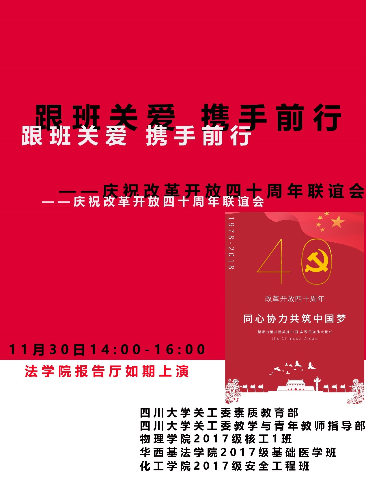 2018年11月30日星期五,由四川大学关工委素质教育部、四川大学关工委教学与青年教师指导部、化学工程学院2017级安全工程班、物理学院2017级核工1班、华西基法学院2017级基础医学班联合举办的跟班关爱活动,于四川大学法学院报告厅顺利举行。校关工委常务副主任唐登学老师、校关工委副主任周荣丰老师、办公室主任任朝清老师、物理学院党委副书记张波老师以及校关工委的老师们莅临此次活动,17级安全工程班、核工1班和基础医学班同学积极参与此次联谊会汇演。