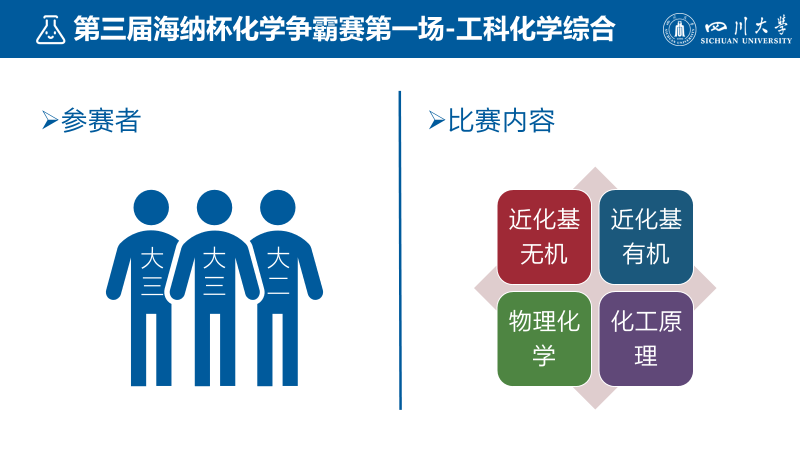 与前两届仅在大一学生中举行不同,本次上场竞技主要为余徽和易美桂老师讲授《化工原理》课程班上的学生,以大三为主。比赛涉及的内容也从近代化学基础无机化学部分扩展到有机化学部分,物理化学及化工原理。该次活动得到了工科化学基地,化学工程学院及四川大学教务处的大力支持,且得到四川大学未来教学研究重点项目的资助。