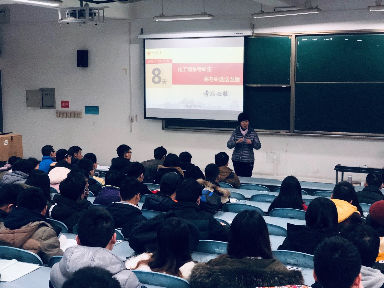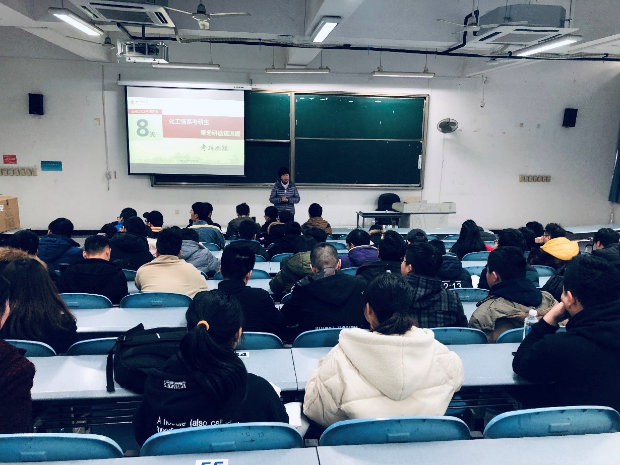 2018年12月14日,“化工情系考研生,寒冬研途送温暖”活动在江安校区综合楼C506成功举办,化工学院党委副书记姜利寒,辅导员郭鑫楠、王瀚黎为化学工程学院2015级所有考研学生加油鼓劲、送去温暖。