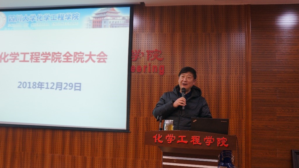 2018年12月29日下午,化学工程学院在望江校区正行楼(西二教)313报告厅召开全院大会。学院党政班子成员和全院教职工参加会议。会议由学院党委书记庞国伟主持并主讲。