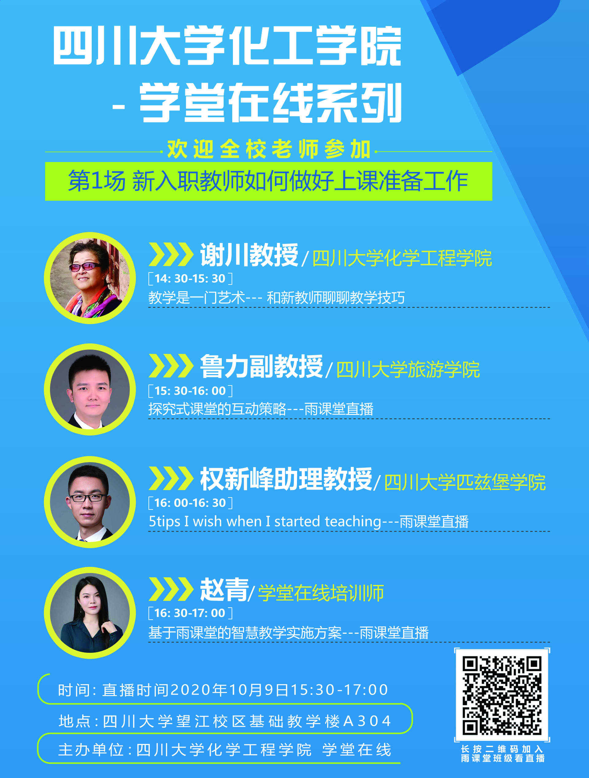 四川大学化学工程学院-学堂在线系列教发活动第1场将于2020年10月9日14:30于望江基教楼A304举行(线上直播为15:30,链接请见海报),主题为新入职教师如何做好上课准备工作,包括教学技巧,互动策略、准备建议和信息化教学工具使用,诚邀全校老师参加。