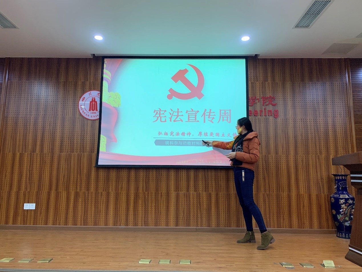 2020年12月4日19点,化学工程学院膜科学与功能材料研究生党支部在正行楼313会议室召开了“弘扬宪法精神,厚植爱国主义情怀”宪法宣传周专题微党课。本次会议由党支部书记田小玉同志主持。支委会黄庆同志负责讲解本次专题微党课内容。